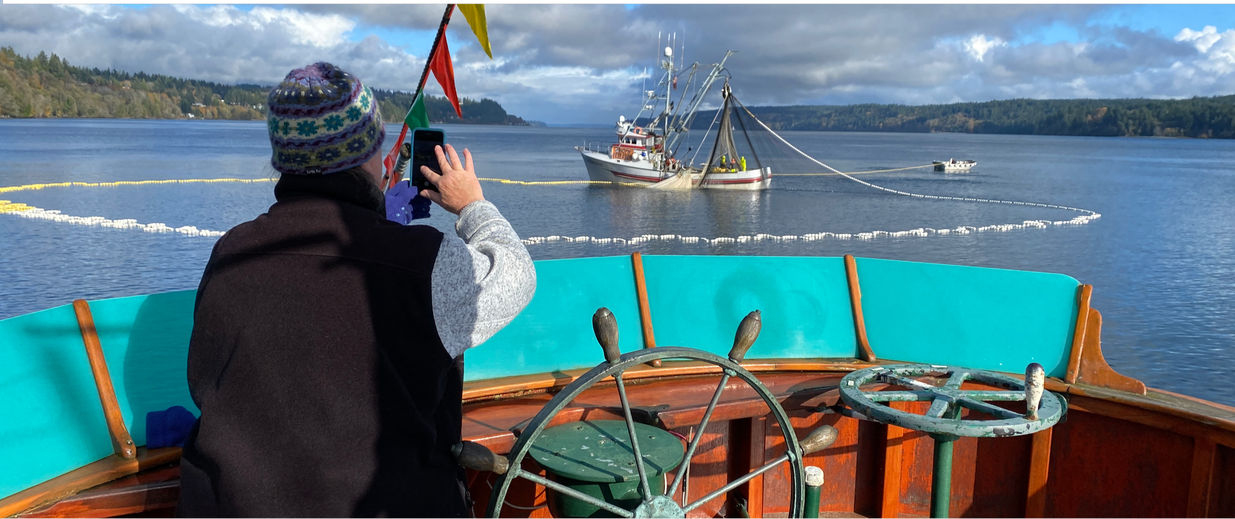 A passenger aboard the BoatShop's classic purse seiner VETERAN during a Commercial Fishing Up Close trip.